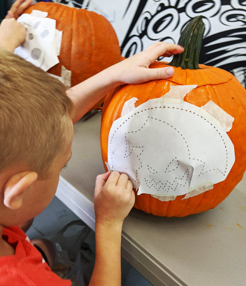 Use a child safe pumpkin carving tool to carve along the dotted lines. Start with the small sections first. Some help from the parents may be needed.