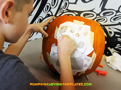 Just print at home, pin on the pumpkin then you start carving. Or you can use a pin to make a dotted line, by poking along the paper pattern, then removing it and follow your dotted line! Its that easy!